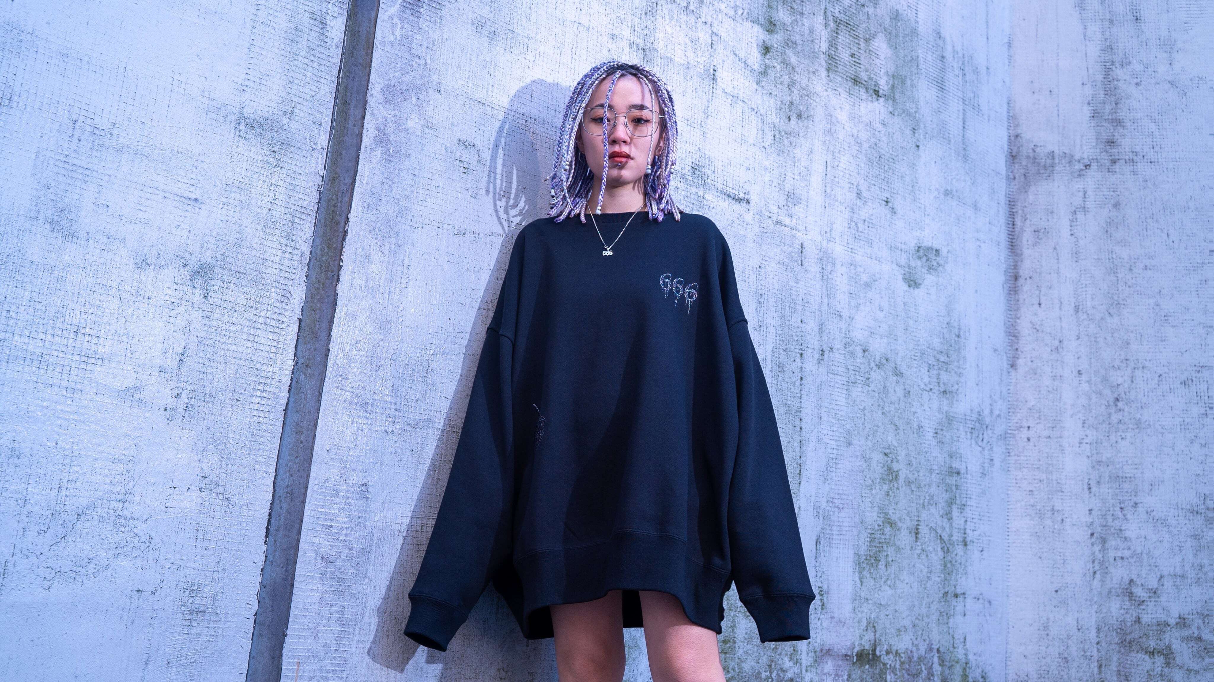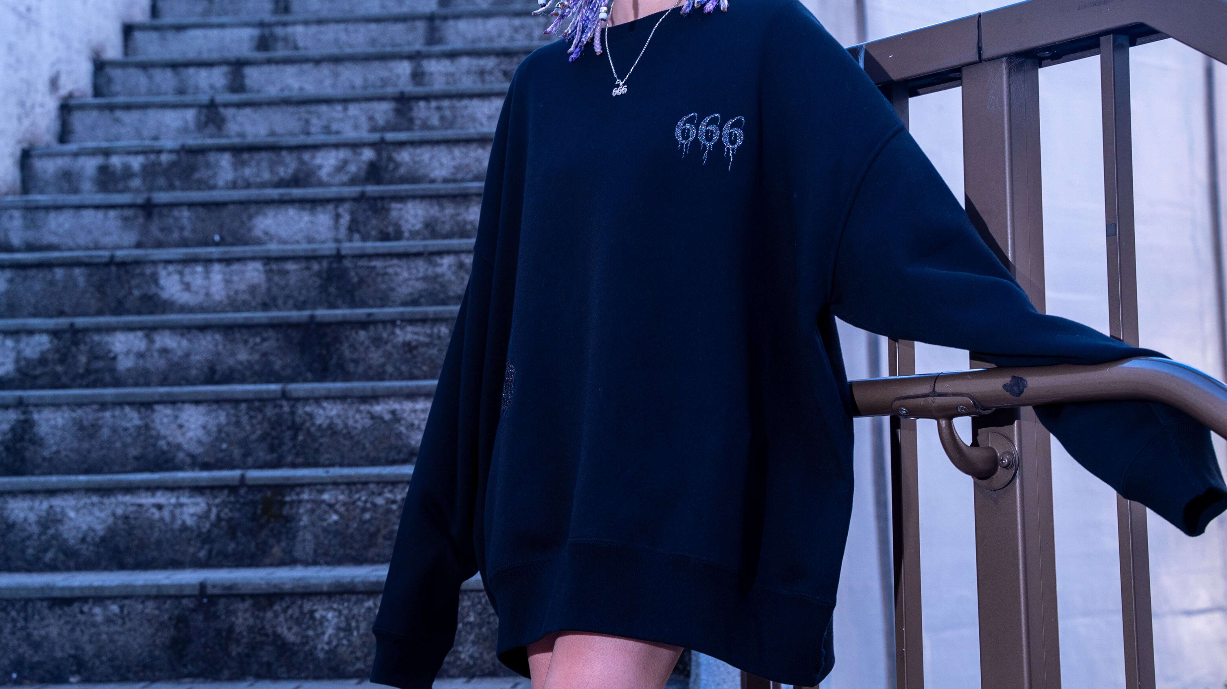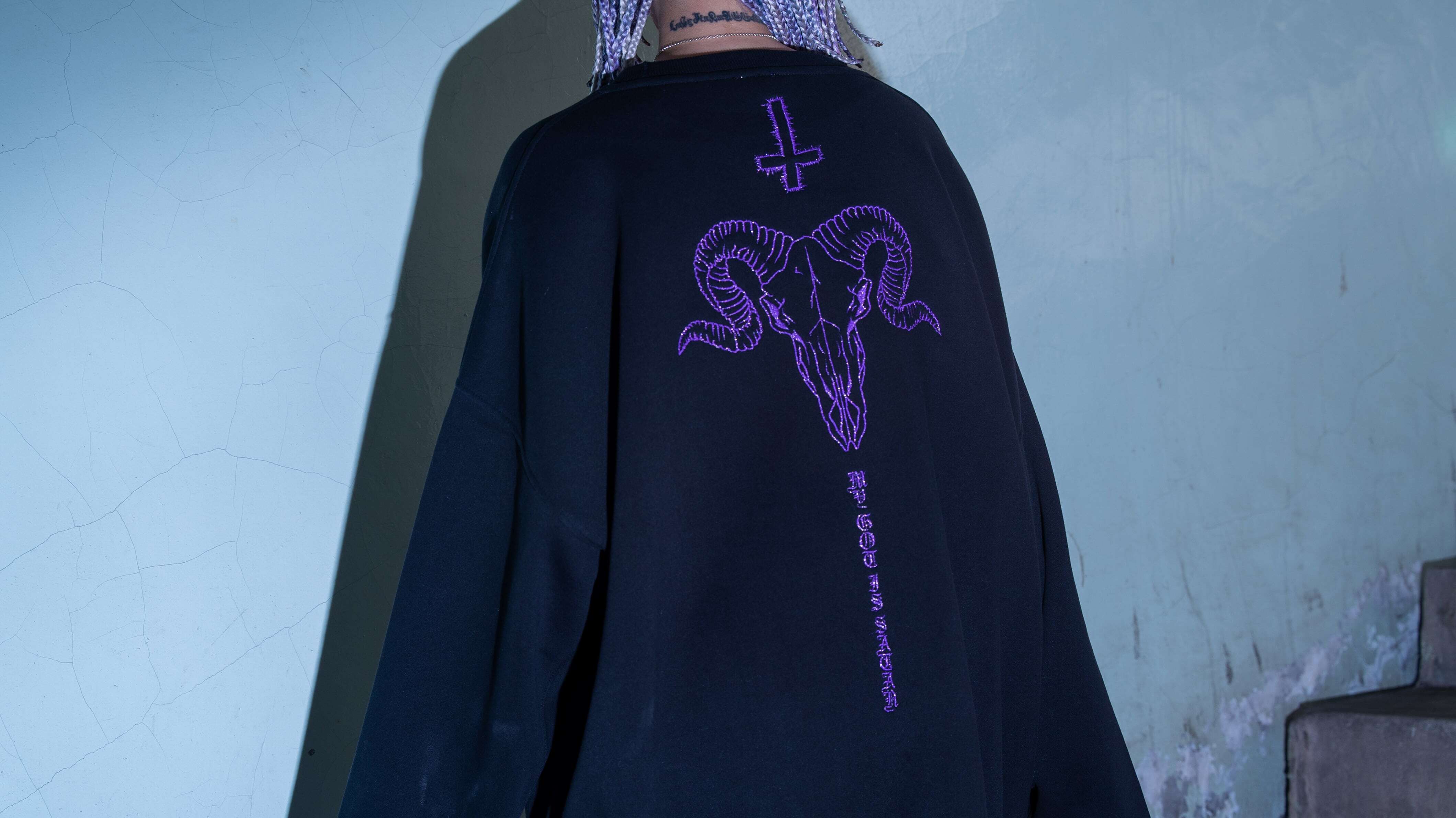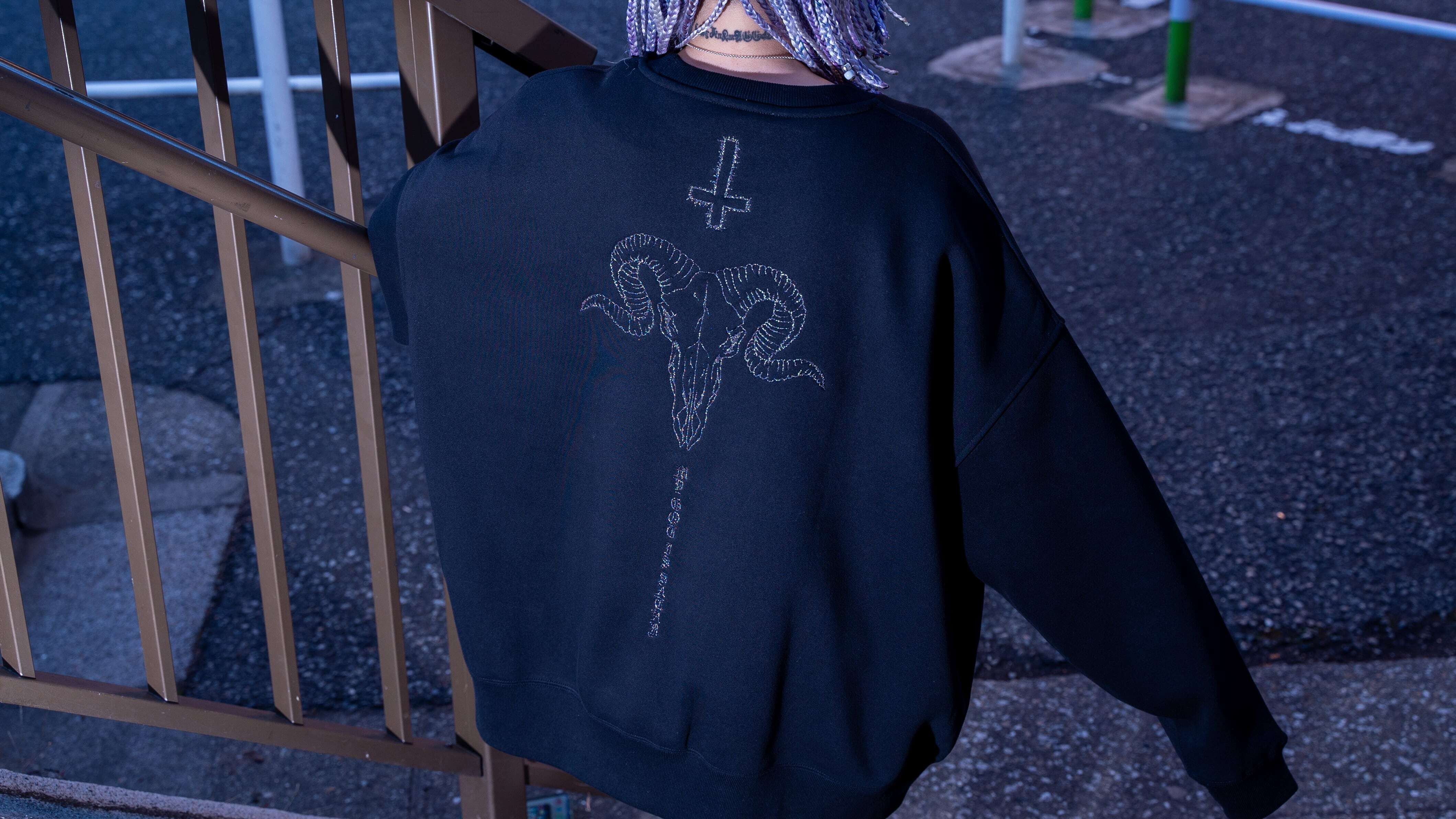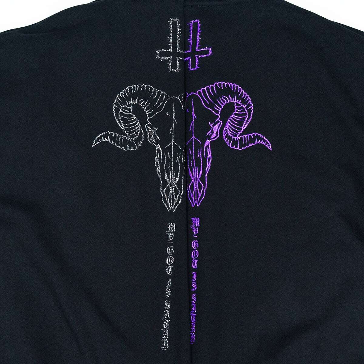 【自由東京 2024 A/W Collection】 GOD IS SATAN Sweater Glitter ver COLOR/BLACK/PURPLE M L XL 身丈 67 71 74 身幅 69. 72 75 肩幅 67 70 73 袖丈 50 51 53